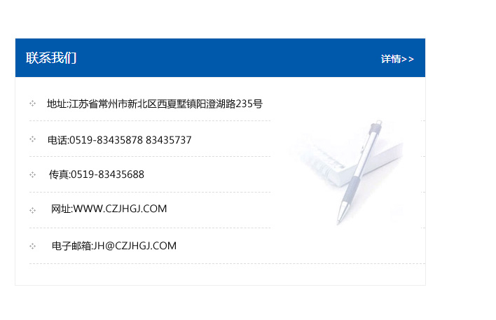 地址:常州市新北區(qū)友邦商務大廈1幢16、17層  電話:0519-85101652  傳真:0519-85112595  郵編:213022  網(wǎng)址:www_cz-jiayue_cn.hnbaianda.com  郵箱:xiajifengaa@163.com